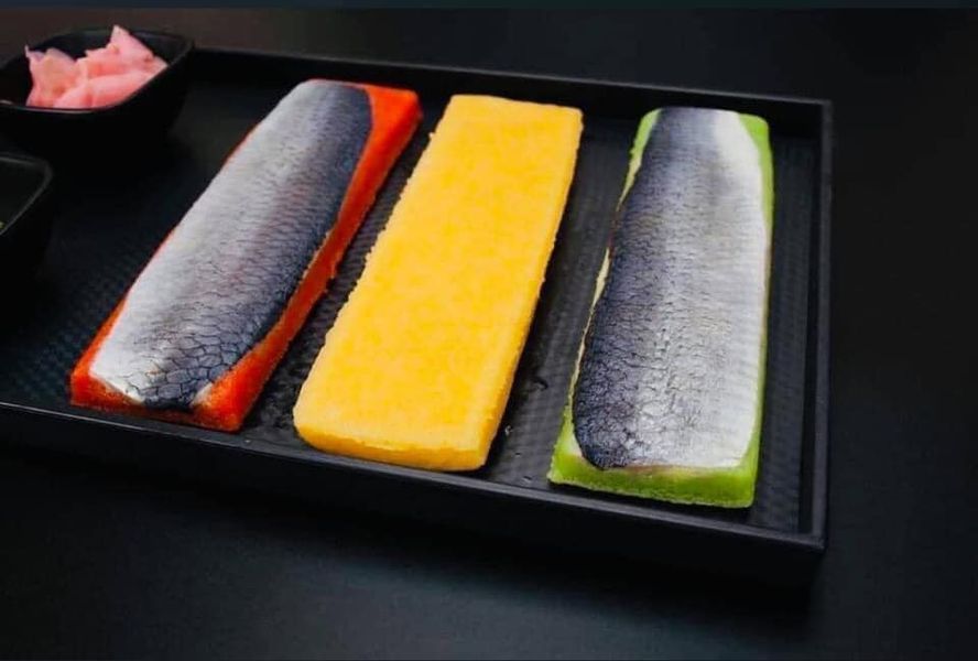 Sushi: cơm dẻo được nắm thành khối chặt, đặt miếng cá trích ép trứng lên trên, dùng rong biển cuộn chặt và thưởng thức.