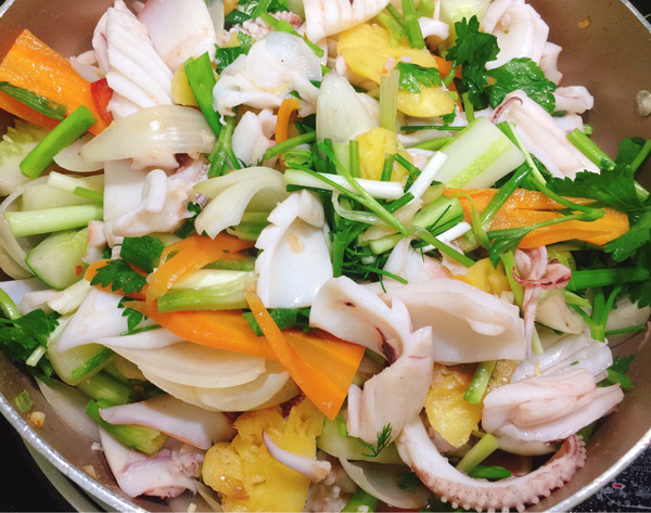 Chế biến: Phi thơm hành rồi đổ mực vào xào, thêm ít rượu để khử tanh; Cho cà chua, hành tây vào xào chung với mực; Cho dứa, cần tây vào sau cùng, nêm ít muối, nước mắm, hạt nêm cho vừa ăn;